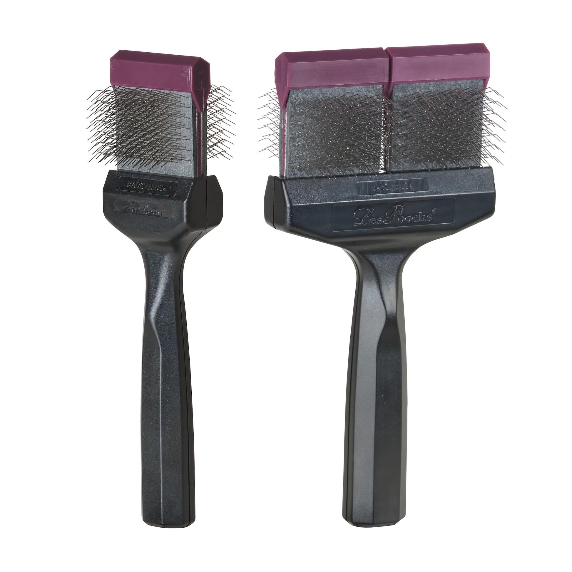 Les Poochs brushes are designed to be used as a system. The Pro Brush – Firm Flexible Head pairs well with the Finishing Brush – Firm Flexible Head for deshedding and the Mat Zapper for removing difficult mats.